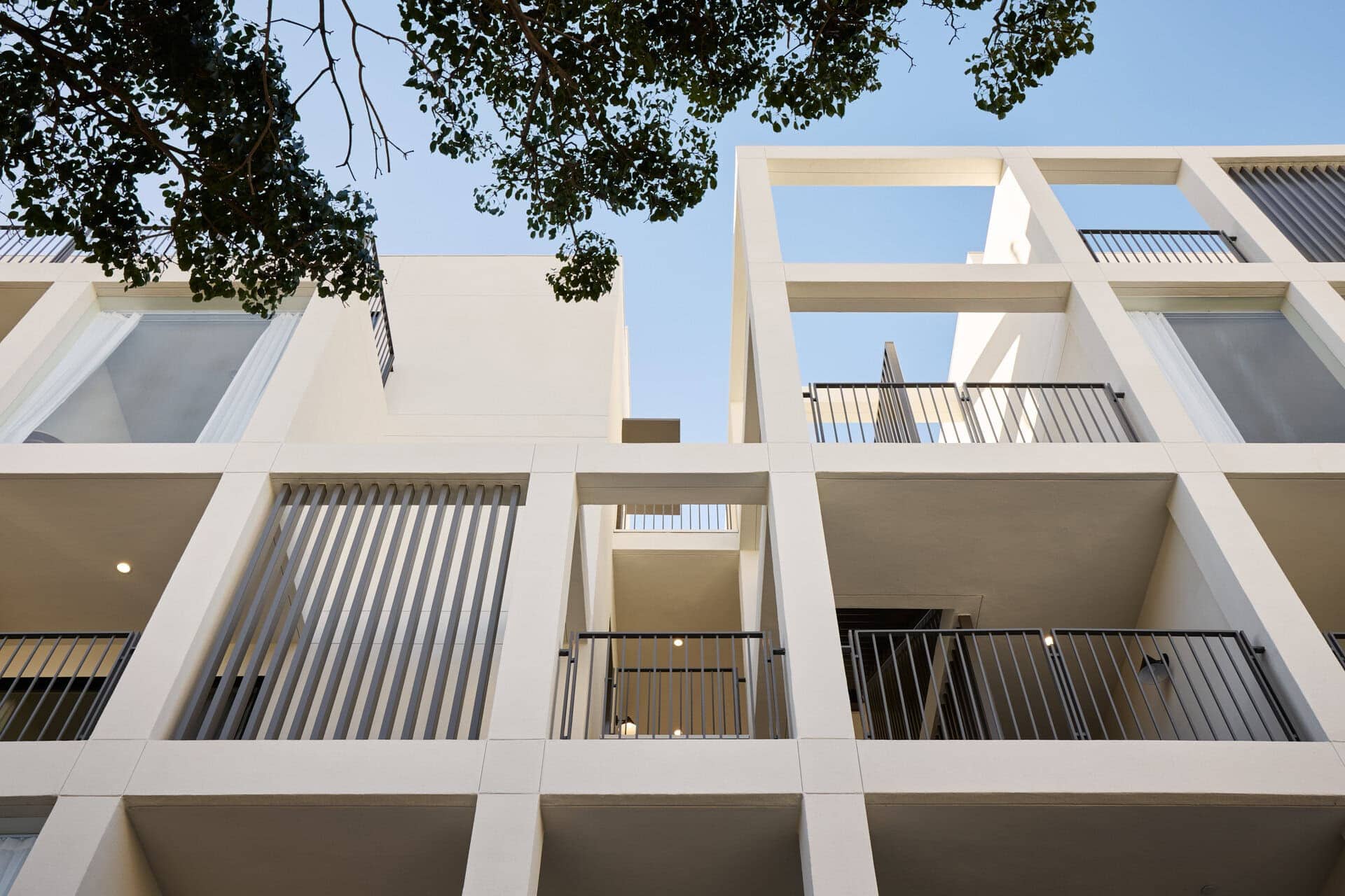 The building’s identity comes from its clean structural grid. This framework creates a calm, minimal façade that contrasts with nearby residential buildings. Vertical fins, open-air balconies, and floor-to-ceiling windows introduce a range of transparency and shadow throughout the day. A landscaped courtyard separates the two residential volumes and brings light and air to each bedroom. In addition, an open corridor links the two masses and reveals internal circulation from the street, creating a sense of openness and clarity.
